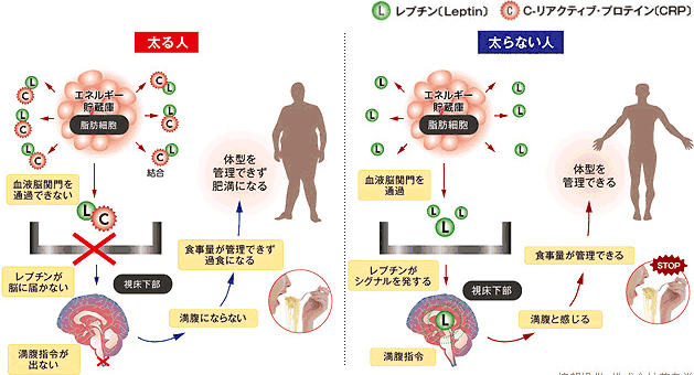 レプチンは超善玉ホルモンとも呼ばれ、主に2つの働きを持つ。 ひとつはいわゆる“満腹中枢刺激ホルモン”としての働きで、脳に「これ以上食べなくてよい」というシグナルを送り過食を抑えるといわれている。 もうひとつは脂肪細胞の多くを占める中性脂肪の分解を促し、エネルギー源として使える脂肪酸に変換させる働きだ。 このレプチンが阻害物質の影響により脳に届きにくくなると食欲抑制の指示が出せなくなり(レプチン抵抗性の亢進)、脂肪が分解されずにエネルギー貯蔵庫である脂肪細胞にどんどん溜め込まれていく。