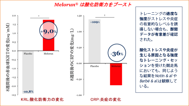 MELORUN®が大量に活用されている現場の一つが競馬場である。 競馬大国フランスはすぐれたサラブレットを産出しているが、そうした馬の脚を筋損傷から守るためにMELORUN®が餌に混ぜて与えられている。 というのも、ある試験で標準的な運動をした16頭の競走馬の炎症と酸化状態、並びに血漿と滑液中の軟骨と筋肉の完全性のバイオマーカーに対するMELORUN®の効果を評価した結果、MELORUN®の全身性の炎症に対するポジティブな効果が明らかになったからだ。 競走馬の集中トレーニングに伴う抗酸化防衛力の減少をSODの摂取が予防していることが実証されたことから、競馬大国フランスを陰で支えるのがMELORUN®。そう言っても過言ではないかもしれない…。