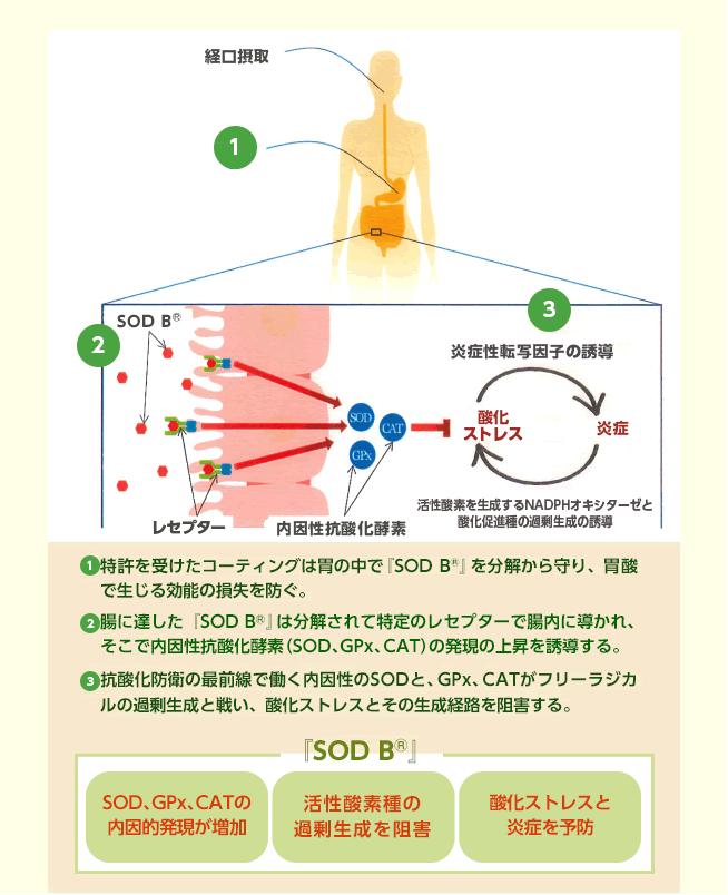 こうした悪影響を予防するには、過剰な活性酸素を無害化し、酸化と抗酸化のバランスをうまく取る必要がある。 体内にはそうした機能が備わっており、それを最前線で担っているのが私たち自身の身体が作り出しているSODを初めとする3つの抗酸化酵素で、一次性抗酸化物とも呼ばれている。 ここで処理しきれない活性酸素は、二次性抗酸化物と呼ばれる体外から摂取したポリフェノールや、ビタミン、ミネラルなどの抗酸化物が対応する。