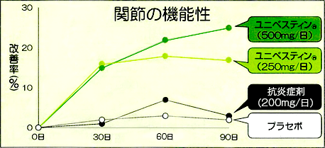 抗炎症剤と比較した臨床試験も行われている。40歳から75歳を対象にした60人の試験では、90日間にわたりその持続性をチェック。30日ごとのWOMAC(変形性関節症の症状評価に用いられるガイドライン)テストで疼痛、こわばり、関節の機能性を評価。あらゆる試験で、ユニベスティン®が抗炎症剤と同等以上の改善効果を示している。